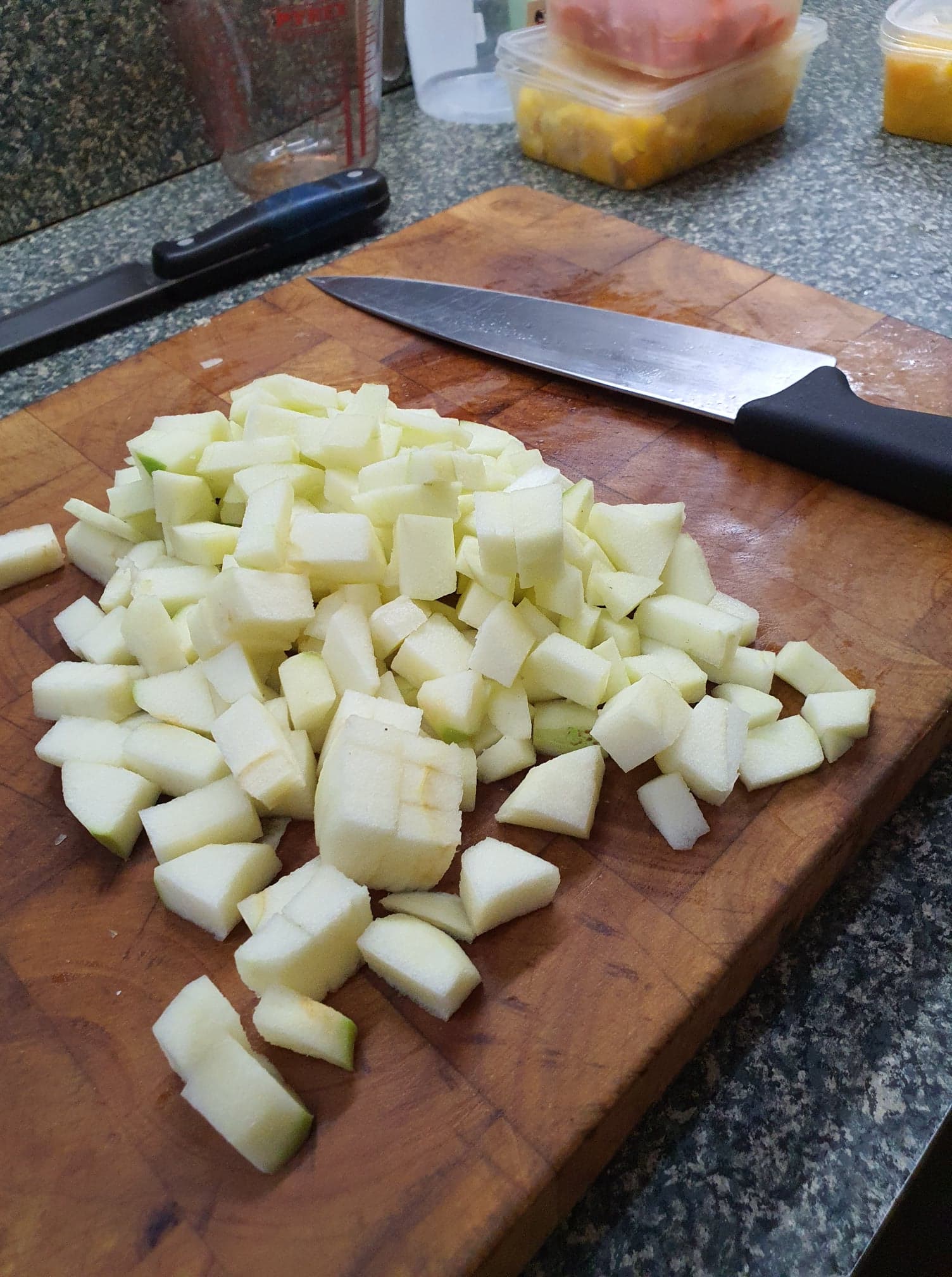 To be added to cooking half an hour before you finish the cooking. This is a presentation trick for the cooking competitions, so that squares of light-coloured mango can be clearly seen in the darker coloured chutney. They must be cooked for at least 30 minutes to ensure they are fully cooked and don’t cause fermentation when bottled.